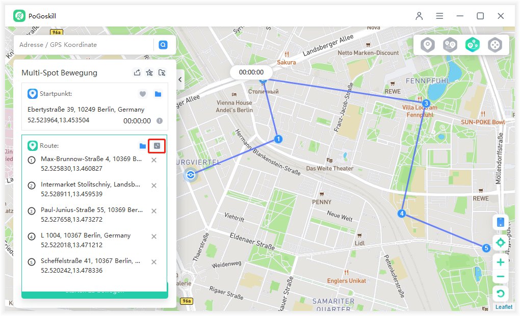 Durch einfaches Tippen auf das zweite Symbol in der unteren rechten Ecke scannt PoGoskill nach Pokéstops und Arenen in der Nähe der von dir gewählten Route. Wähle einfach deinen Weg und klicke auf „Starten zu ändern“, um die automatische Suche zu starten.