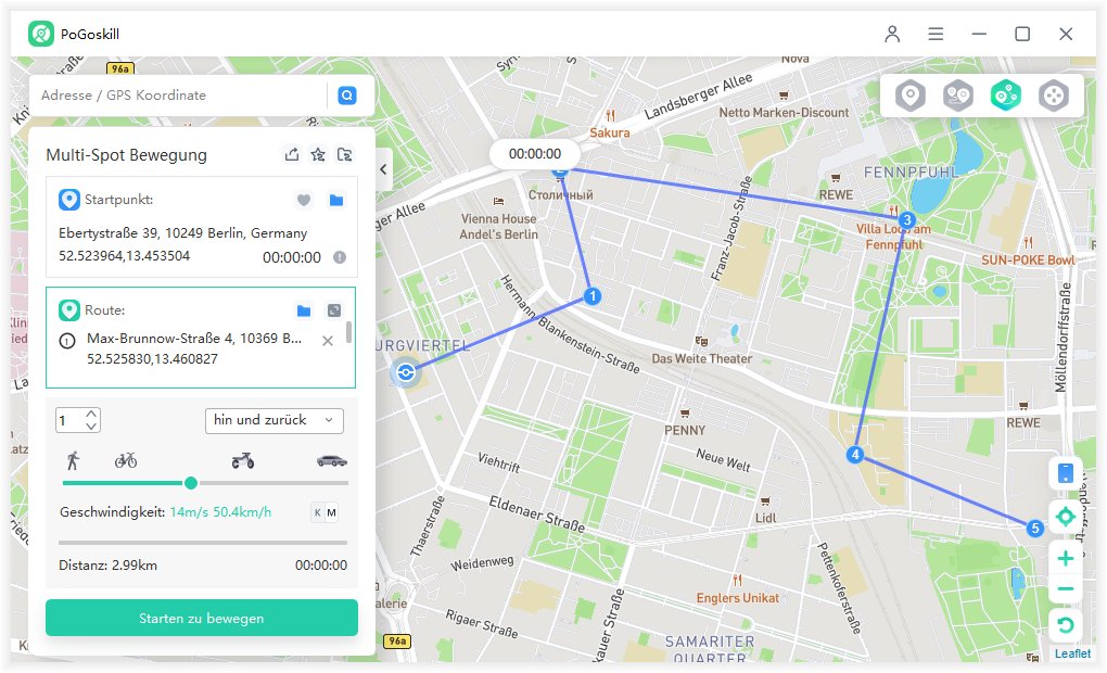 dich bewegen möchtest. Du kannst Geh-, Rad- oder Fahrgeschwindigkeit wählen.